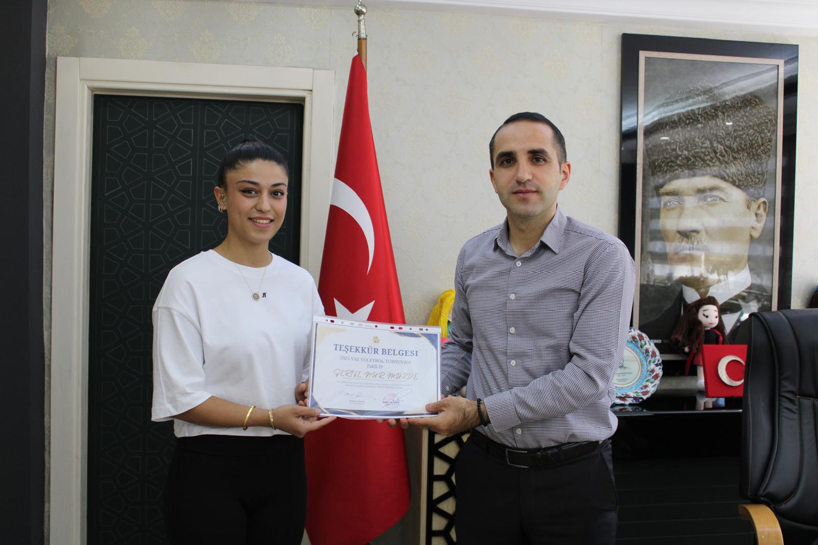 Kaymakam Polat, "Yaz Voleybol Turnuvas?"nda göstermi? olduklar? özverili ve gayretli çal??malar?ndan dolay? ö?retmen ve antrenörlere te?ekkürlerini iletti. Ziyaret s?ras?nda, turnuvan?n ba?ar?l? bir ?ekilde tamamlanmas?ndaki katk?lar?ndan dolay? kendilerine Ba?ar? Belgesi ve Te?ekkür Belgesi takdim edildi.