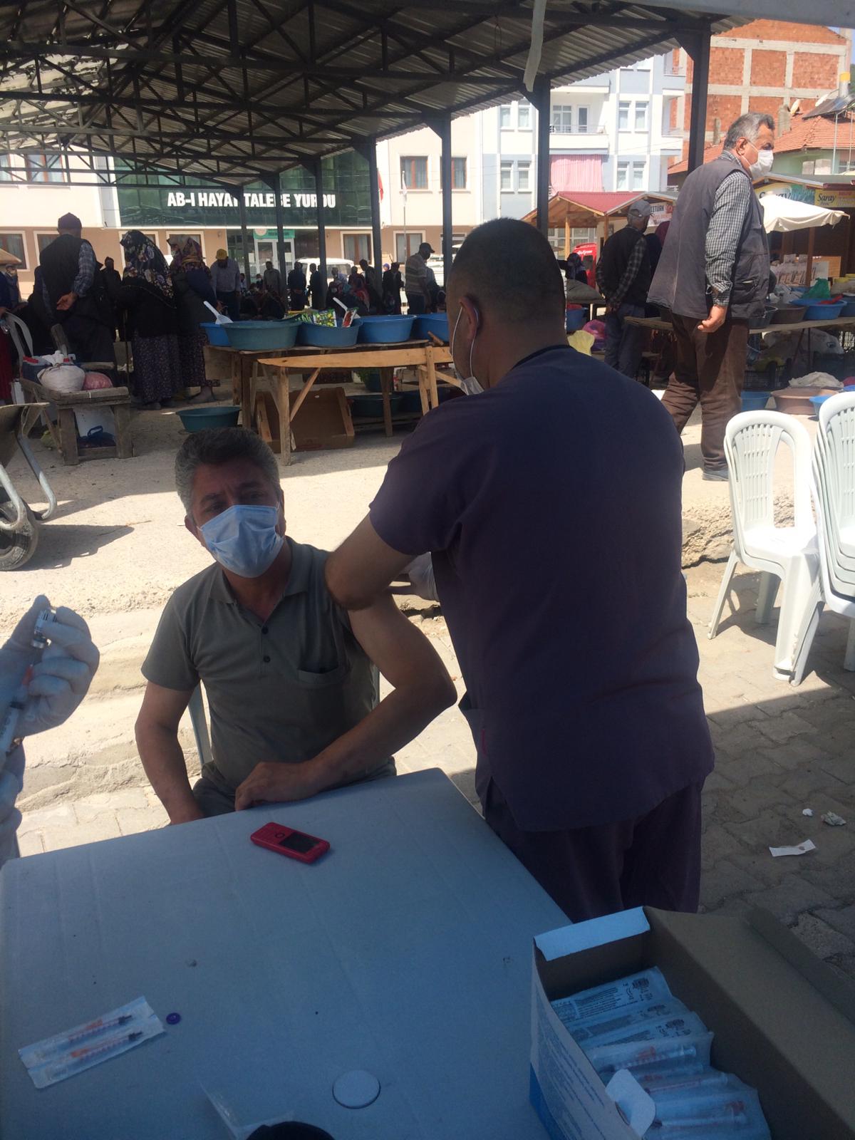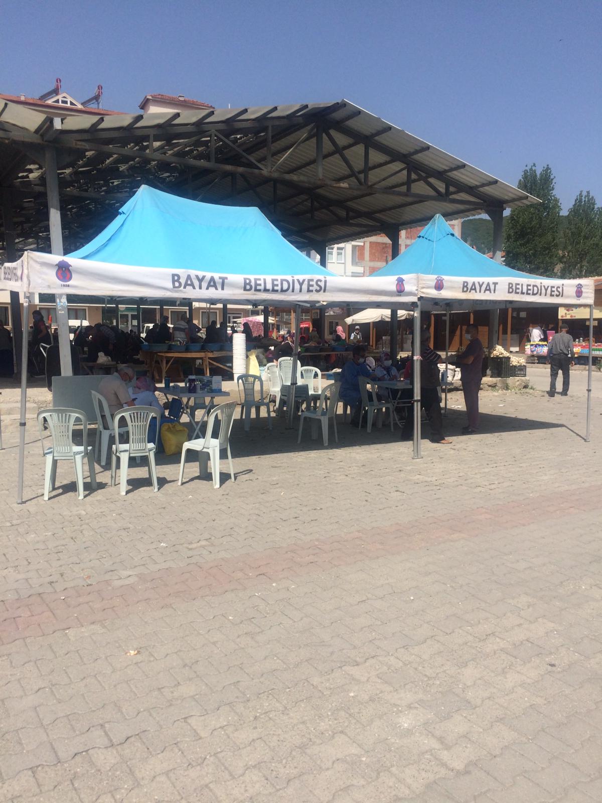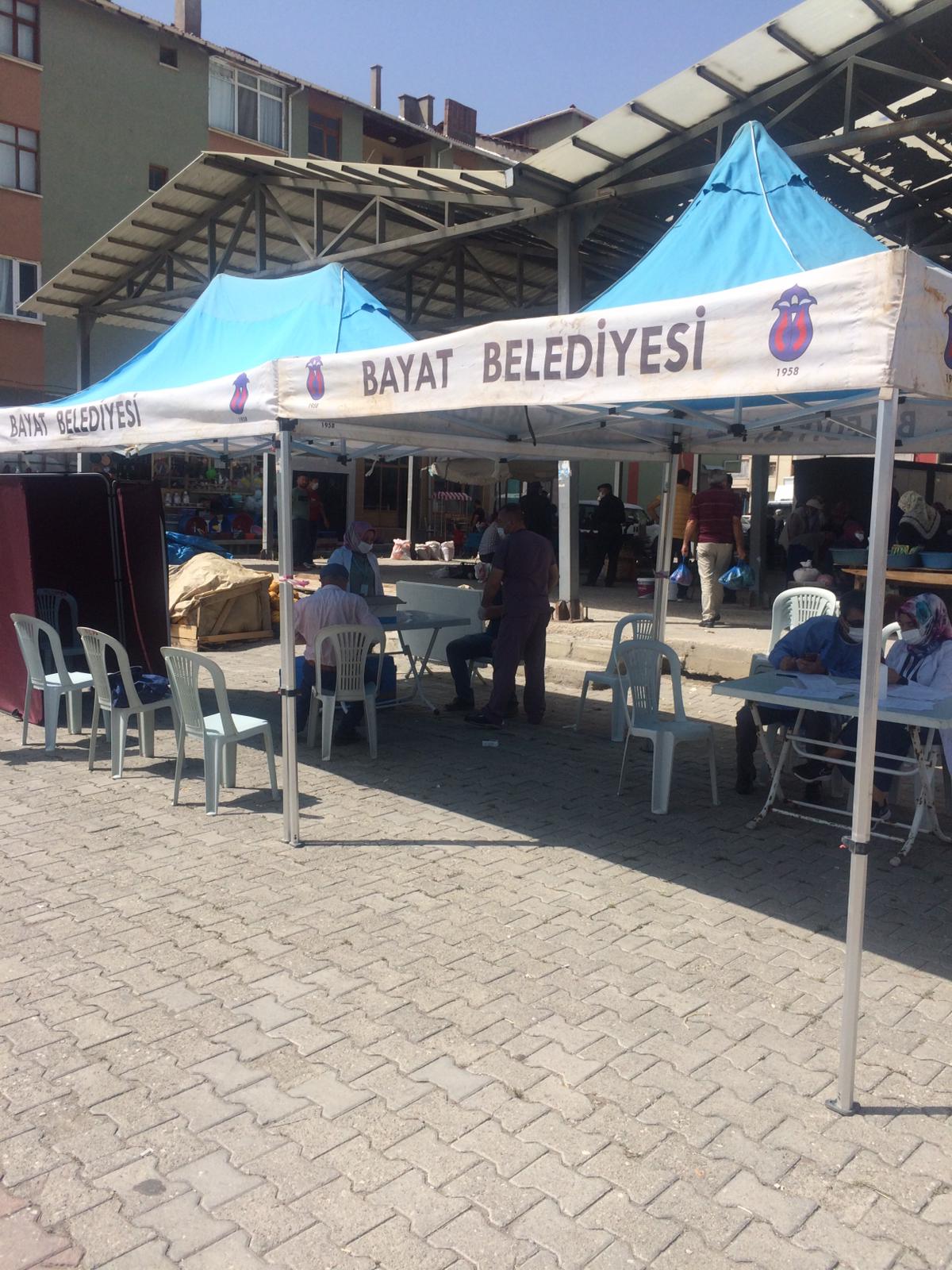 İlçe Sağlık Müdürlüğünce sebze pazarında kurulan çadıra gelen ilçe sakinleri, sağlık ekiplerince aşılanıyor. Çadırda görevli sağlık çalışanları, Sağlık Bakanlığı'nın yürüttüğü aşı kampanyası çerçevesinde vatandaşlara randevusuz aşı yaptıklarını söyledi. Ayrıca Bayat Belediyesi ve Belediye Başkanı Ekrem Ünlü’ye pandemi süresince vermiş olduğu desteklerden dolayı teşekkür ettiler. Hastane ve aile hekimliklerinde aşı polikliniklerinin yanı sıra vatandaşların aşıya rahat ulaşması adına stant kuruldu. Burada hem vatandaşlara randevusuz bir şekilde aşıya ulaşmaları sağlanıyor hem de aşıyla alakalı sorular yanıtlanıyor. Aşı yaptıran vatandaşlar ise uygulamadan duydukları memnuniyeti dile getirdi.
