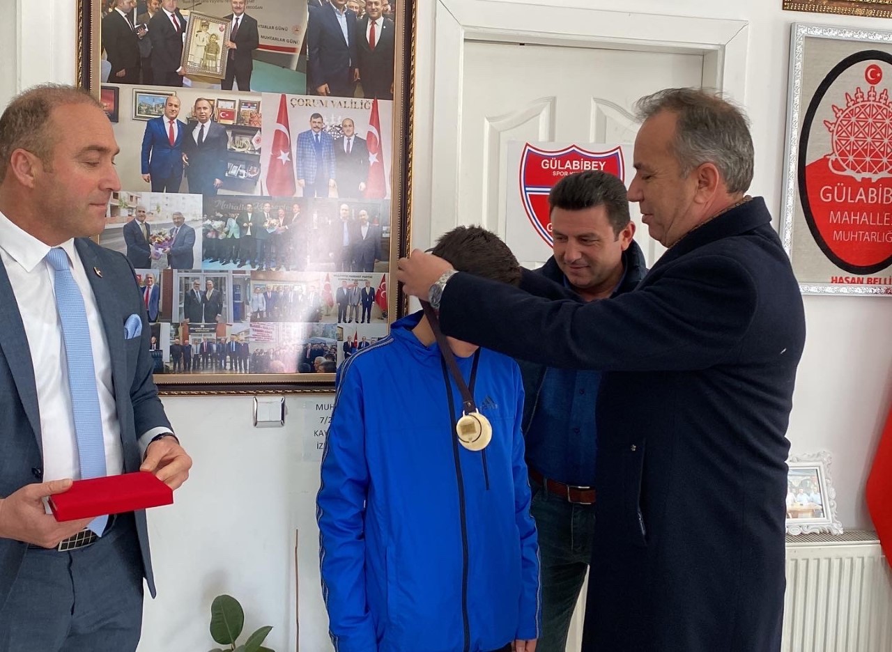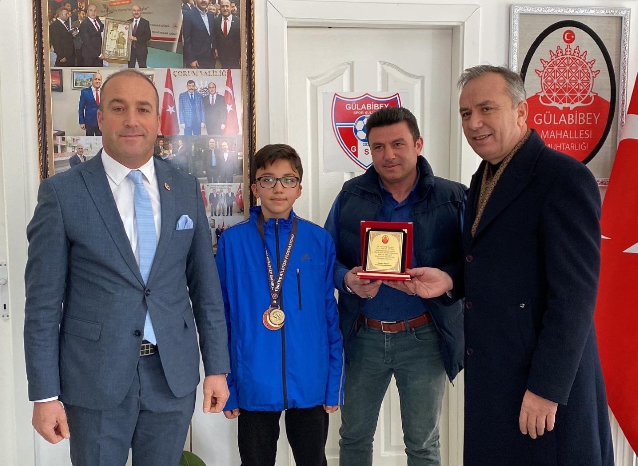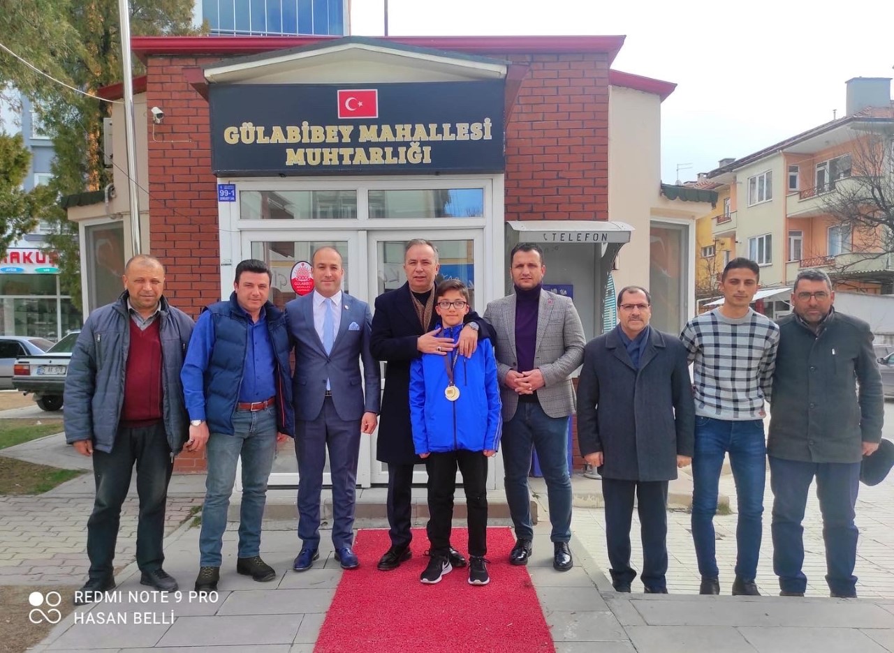 Gülabibey Mahallesi Muhtarı Hasan Belli ve AK Parti Gülabibey Mahallesi Başkanı Osman Çorlu ve Muhtarlıklar Müdürü Mustafa Kanat’ın da hazır bulunduğu organizasyonda şampiyon sporcu Mert Ali Erdal, Milletvekili Ahmet Sami Ceylan tarafından plaket ile ödüllendirildi.
