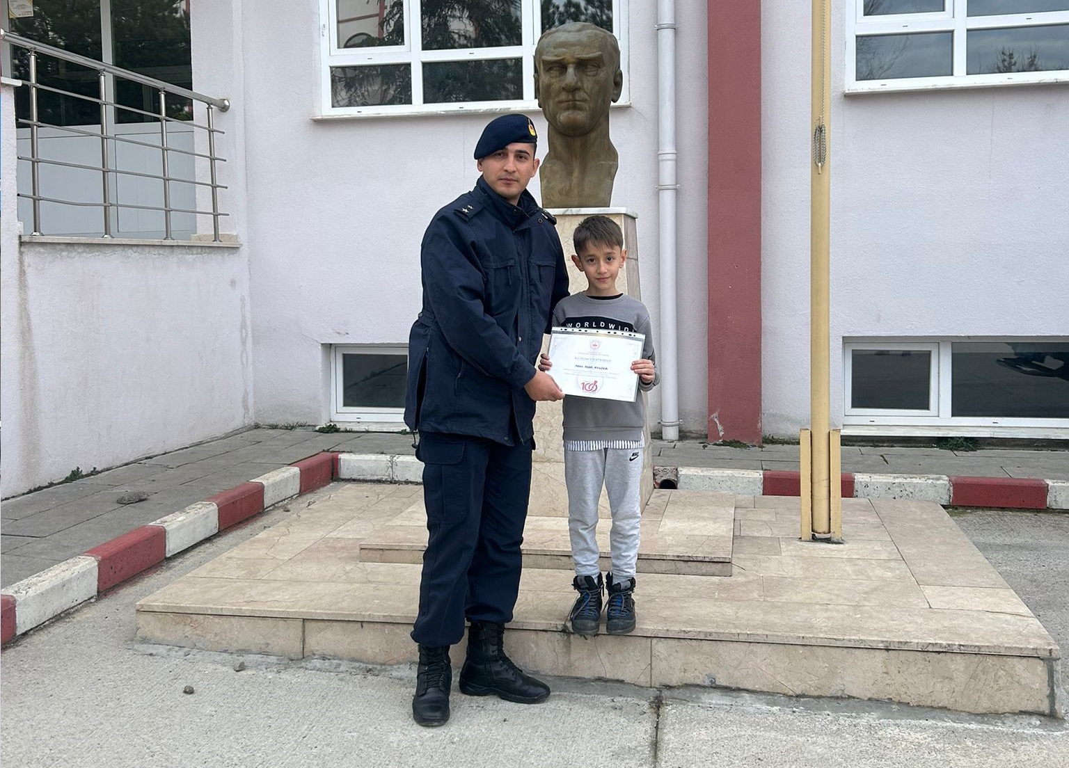 İskilip Jandarma Komutanı Jandarma Üsteğmen Hakan Güven Aras Arda Akkoca'yı tebrik ederek, Jandarma Genel Komutanlığınca gönderilen hediyeyi teslim etti.