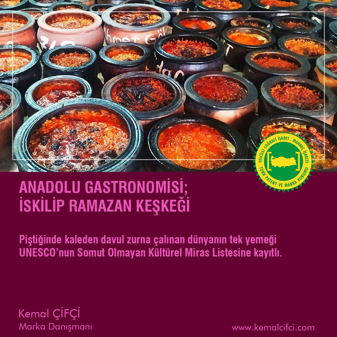 ANADOLU GASTRONOMİSİ; İSKİLİP RAMAZAN KEŞKEĞİ Kemal Çifçi / Marka Danışmanı Piştiğinde kaleden davul zurna çalınan dünyanın tek yemeği UNESCO’nun Somut Olmayan Kültürel Miras Listesine kayıtlı. Sabahtan hazırlanıp sekiz saatte odun ateşinde bekletilen keşkek; Fırıncıyla sahibini karşı karşıya getirir azda olsa. Yapan hanımın maharetini gösteren keşkek; aynı zamanda UNESCO’nun Somut Olmayan Kültürel Miras Listesine kayıtlı. Muziplerin nasibim bu deyip gözüne kestirdiği keşkeğini eve götürmesi ise Anadolu insanın hoşgörüsünden kaynaklanır. Geleneği ve lezzeti bu satırlara sığmayacak olan İskilip ramazan keşkeğini yemek için İskilip’te olmaktan başka şansınız yok. 23 Eylül 2021 tarihinde İskilip Belediyesi tarafından tescil edilen 902 no’lu coğrafi işaretli ürünümüz mahreç olarak tescil edilmiştir.
