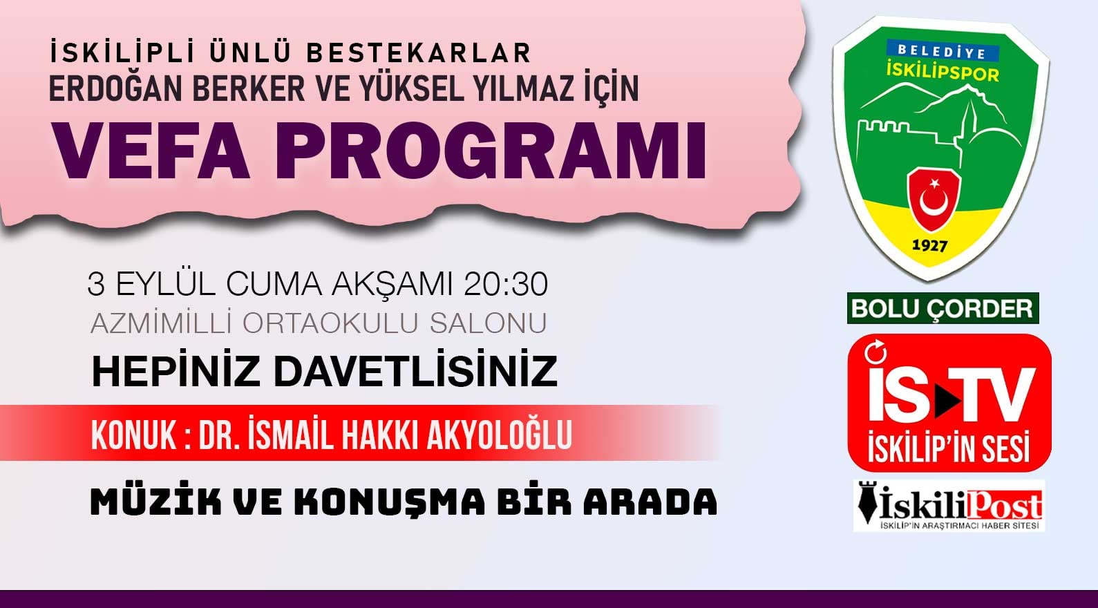 3 Eylül Cuma günü akşamı Belediye İskilipspor, Bolu Çor-Der, Şehri İskilip Cemiyeti, İskilip’in Sesi Televizyonu ve İskilipost haber sitesi işbirliği ile İskilipli Bestekarlara Vefa gecesi programı düzenleniyor.