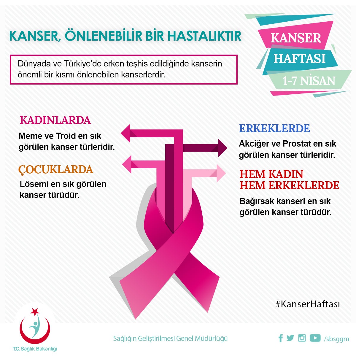 Kanser, dünyada ve ülkemizde sebebi bilinen ölümler arasında kalp ve damar hastalıklarından sonra ikinci sırada yer alan önemli bir halk sağlığı sorunudur. Aynı zamanda yüksek tedavi maliyetleri nedeniyle ülke ekonomilerinde ve iş gücünde çok ağır kayıplara neden olabilmektedir. Oysa erken teşhis edildiğinde tedavinin mümkün olduğu ve yaşam kalitesinin artırılabildiği kanser türleri olduğu düşünülürse korunmanın önemi daha da artmaktadır. Teknolojinin ve tıbbın ilerlemesi ile elde edilen sonuçların daha etkin kullanılması ve halkı bilgilendirme/bilinçlendirme/farkındalık kazandırma çalışmalarına yoğunluk verilmesi amacıyla düzenlenen “1- 7 Nisan Kanser Haftası” etkinlikleri, kanser mücadelesinde oldukça önemli bir yer tutmaktadır.