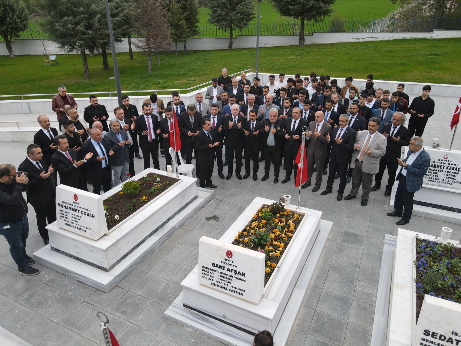 Şehitlikte bulunan şehit kabirlerine çiçek bırakarak dua eden Milletvekili Adayı Vahit Kayrıcı ve beraberindekiler okunan Kur’an-ı Kerim tilavetinin ardından tüm şehitler için dua ettiler.