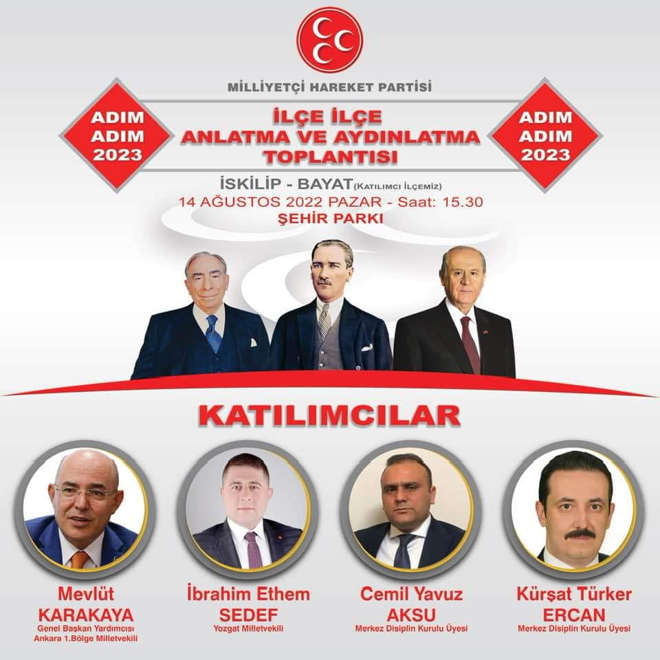 MHP Lideri Devlet Bahçeli’nin talimatı ile Parti Genel Merkezinin organize ettiği ‘’Adım Adım 2023, İlçe İlçe Anlatma ve Aydınlatma’’ temalı toplantıları kapsamında İskilip programı 14 Ağustos 2022 Pazar günü saat 15.00’te İskilip Başbuğ Alparslan Türkeş Şehir Parkında gerçekleştirilecek. Programa Milliyetçi Hareket Partisi Genel Başkan Yardımcısı Mevlüt Karakaya, Yozgat Milletvekili İbrahim Ethem Sedef, MHP Genel Merkez Disiplin Kurulu Üyeleri Cemil Yavuz Aksu, Kürşat Türker, Belediye Başkanlığı ile İl ve İlçe Teşkilatları katılacak. Toplantıya tüm İskilip halkı davet edildi.