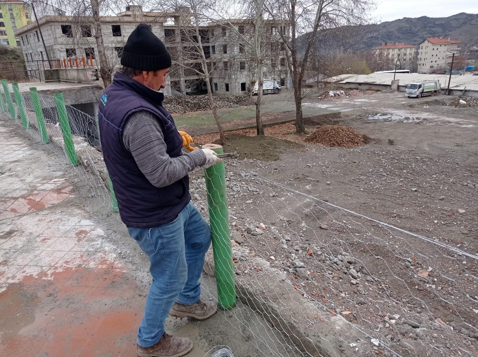 Belediye ekipleri, yaya can güvenliğini sağlamak amacıyla çürük raporu verildikten sonra yıkımına başlanan Meslek Yüksekokulu yanındaki tehlikeli kaldırımda, tel örgü bariyer çalışması yaptı.